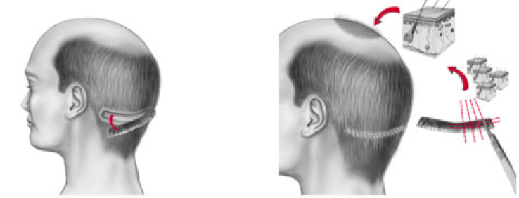 A strip of scalp is removed from the back and side of the head, where they never fall. The cut is sutured. In most cases, after healing there will be an almost invisible scar thread.