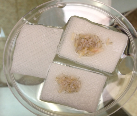 The strip removed is between 10 and 20 cm long and 1.2 cm width. Then it is cut through a microscope in grafts of 1 to 3 hairs (micro grafts).